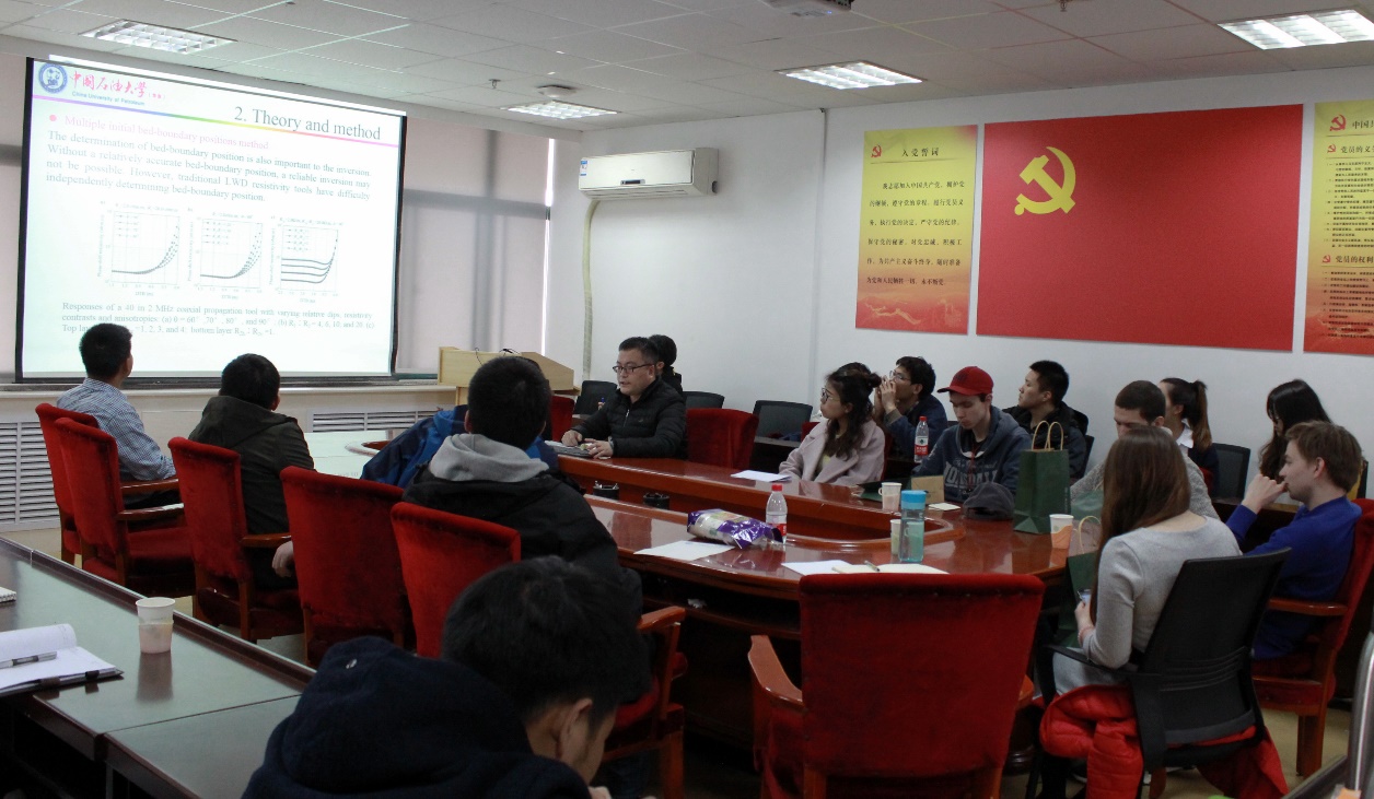 【本站讯】4月10日,测井系暨国际岩石物理与测井分析家协会华东分会(ECC-SPWLA)研究生学术交流会顺利举行。测井系师生和来自俄罗斯彼尔姆国立大学的国际交流生等30余人参加了本次交流会。Elizaveta Ovchinnikova、胡旭飞、田立立、陈前、宋佳佳、邱飞等作了最新科研成果的学术报告,内容涉及了测井方法理论与测井评价等多个前沿课题。会议全程采用英文交流,与会师生对报告内容展开了热烈研讨。