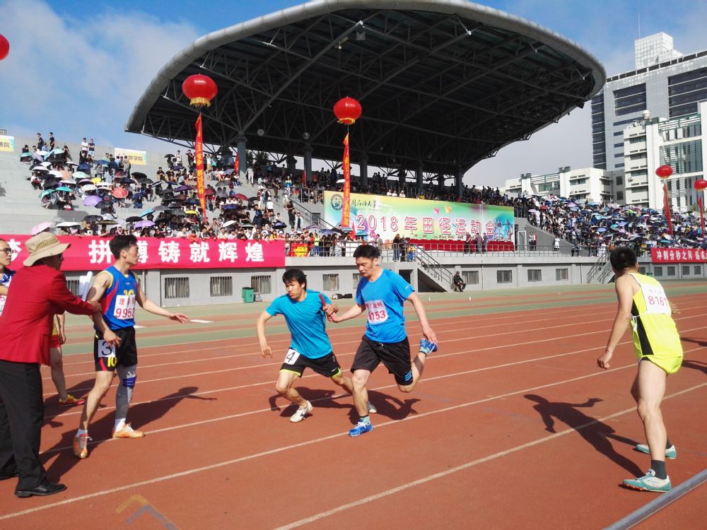 由王斌、马存飞、远二辉、玉素甫江.艾买提四位老师完成的男丙4*400米,拿下冠军,创造了奇迹,确保了团体总分第一!这是一次伟大的接力赛:远二辉超了3、4个对手,玉素甫江.艾买提曾在弯道被理学院超越,冲刺阶段又反超回来,真是好样的!