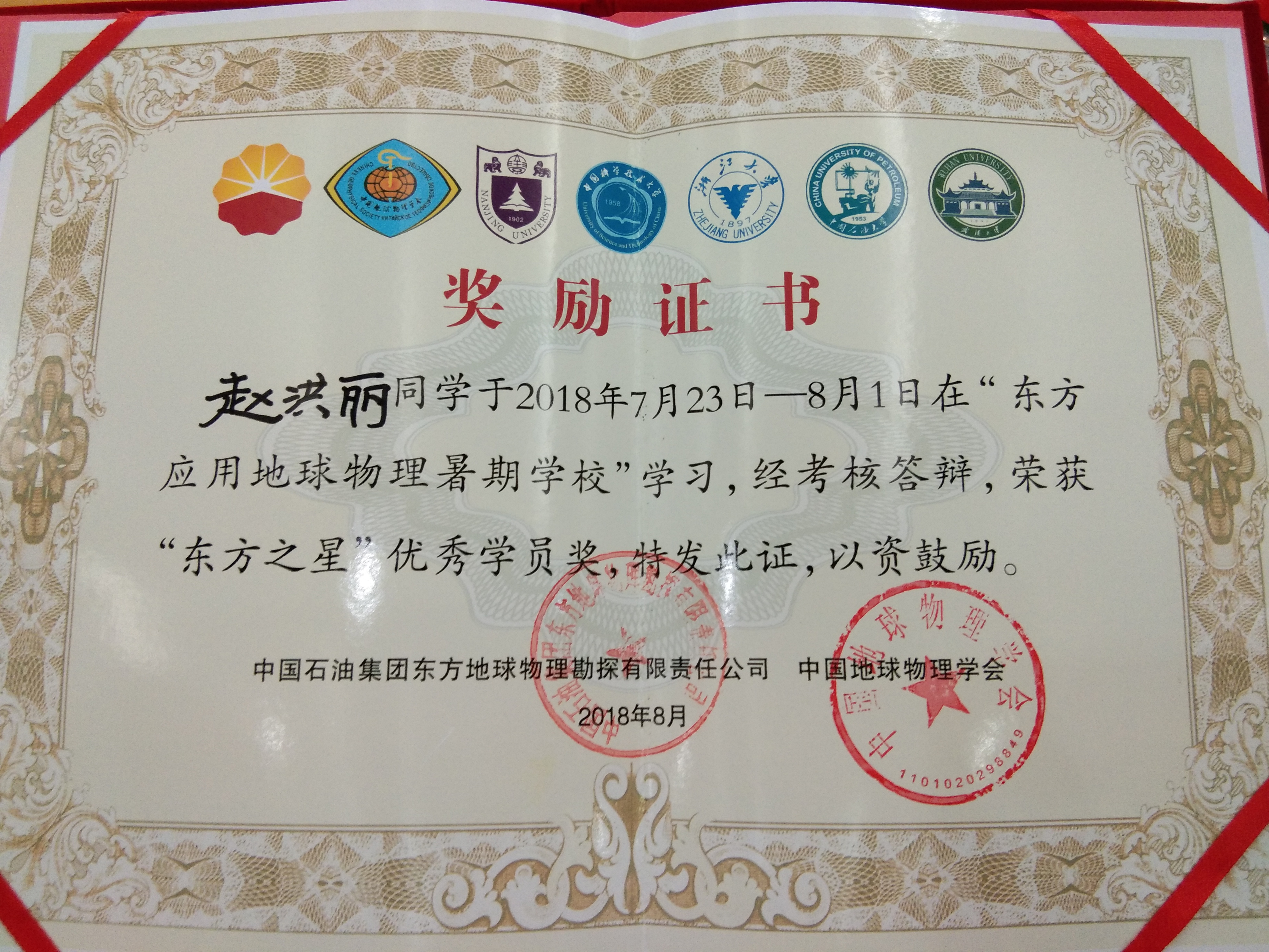 赵洪丽同学获“东方之星”优秀学员奖