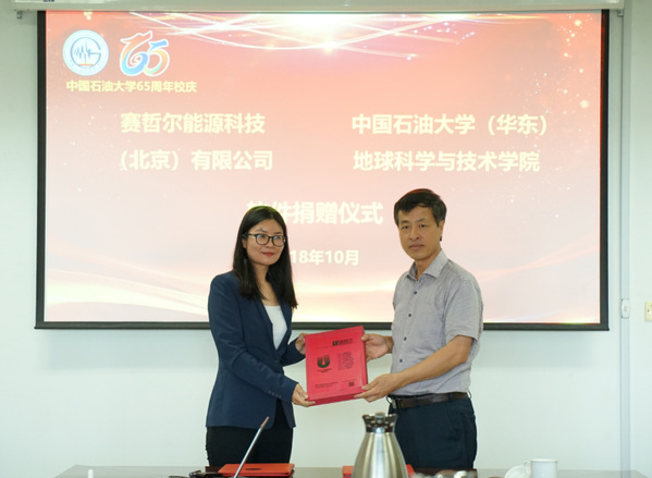 【本站讯】10月1日下午,MG冰球突破官网网站“赛哲尔能源科技(北京)有限公司软件捐赠仪式”在工科楼C座251会议室举行。捐赠仪式由学院副院长裴仰文主持,院长林承焰、党委书记张卫东、副院长邓少贵等出席捐赠仪式,我校89级校友、赛哲尔能源科技(北京)有限公司法人、总经理赵锋女士向学校捐赠该公司研发的“UniEarth储层岩石物理软件”,学院测井系、地球物理系的师生参加捐赠仪式。