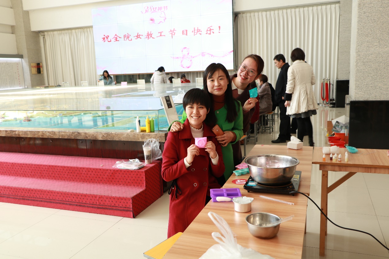 合影结束后活动正式拉开帷幕。在活动中老师们或执画笔感受油画的魅力,或亲自动手进行手工皂DIY。在手工皂DIY中,从材料的制备,到最后作品的定型,每一步老师们都表现的一丝不苟,在出现问题时老师便一起讨论交流直到解决问题。在油画创作中,仅仅就调制颜料这一步,老师们都要求得非常严格。在油画老师的指导下,女同胞们充分发挥自己的创作才能和地院人特有的艺术范,完成了自己得意的佳作。除了有机器猫、Kitty以及各种花朵的手工品之外,还有《向日葵》、《星夜》、《星空》等“世界级名画”。在活动最后,每位老师对自己以及其他的作品进行拍照留念,并且相互分享自己的经验和喜悦。