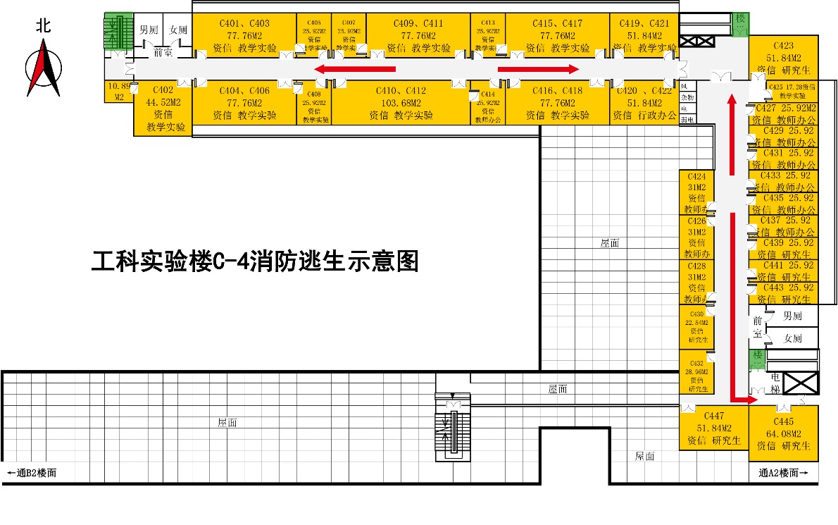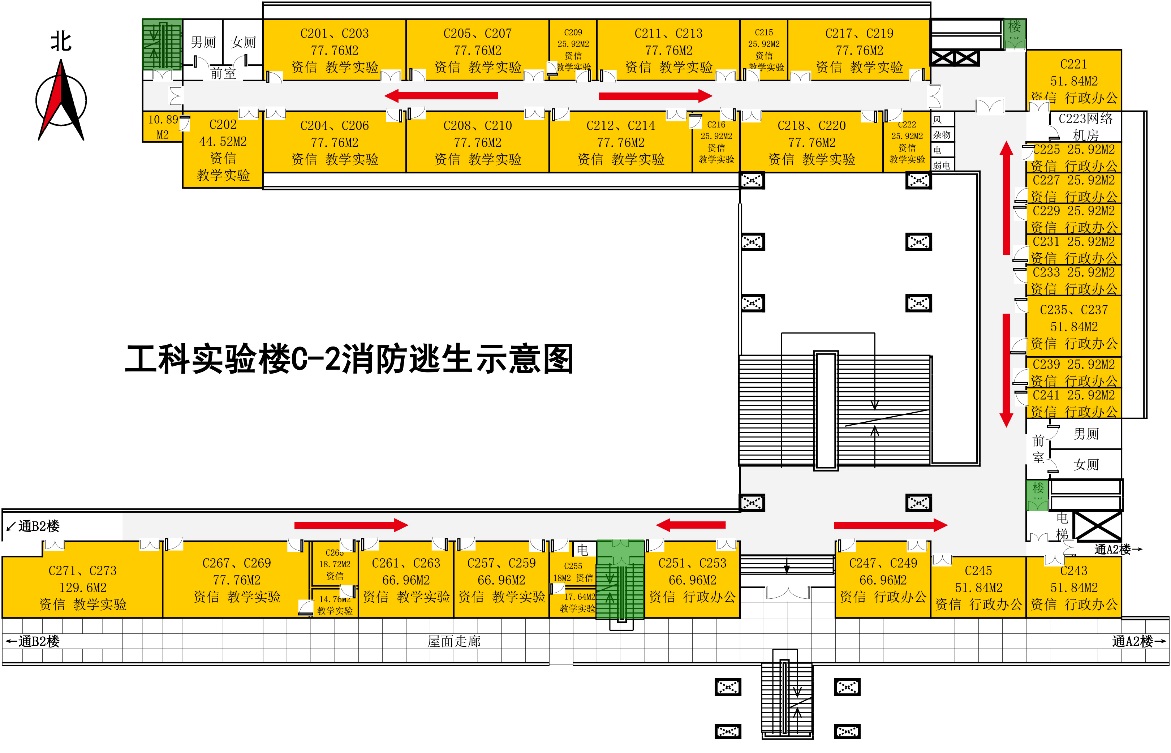 4、安全疏散基本路线:楼内各工作室——就近楼梯——安全出口——工科楼C座与D座间的U形空间;在左侧的师生从左楼梯撤离,靠右侧的师生从右楼梯撤离。