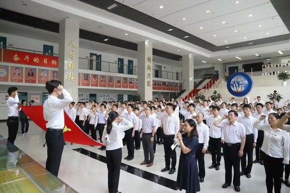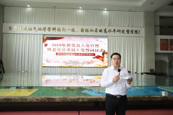 【本站讯】为庆祝中国共产党成立98周年,7月1日清晨,MG冰球突破官网网站举行2019年新党员入党宣誓仪式。同时,学院党委委员、组织员、教工支部委员等30余位教工党员代表亲临现场重温入党誓词。学院党委副书记徐永涛主持仪式。
