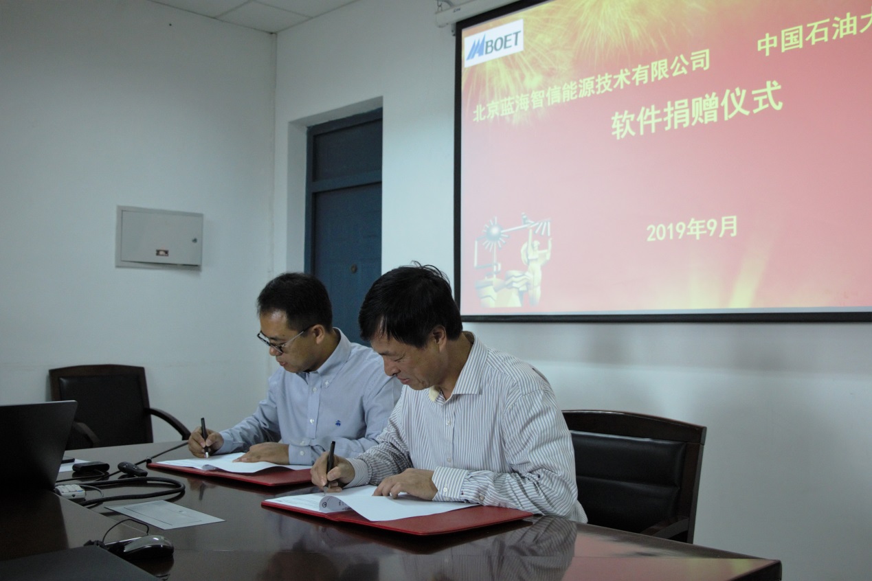 MG冰球突破官网网站院长林承焰、副总裁刘冠德签订软件捐赠协议,林承焰院长代表MG冰球突破官网网站接受捐赠。副校长姚军为刘冠德颁发捐赠证书。