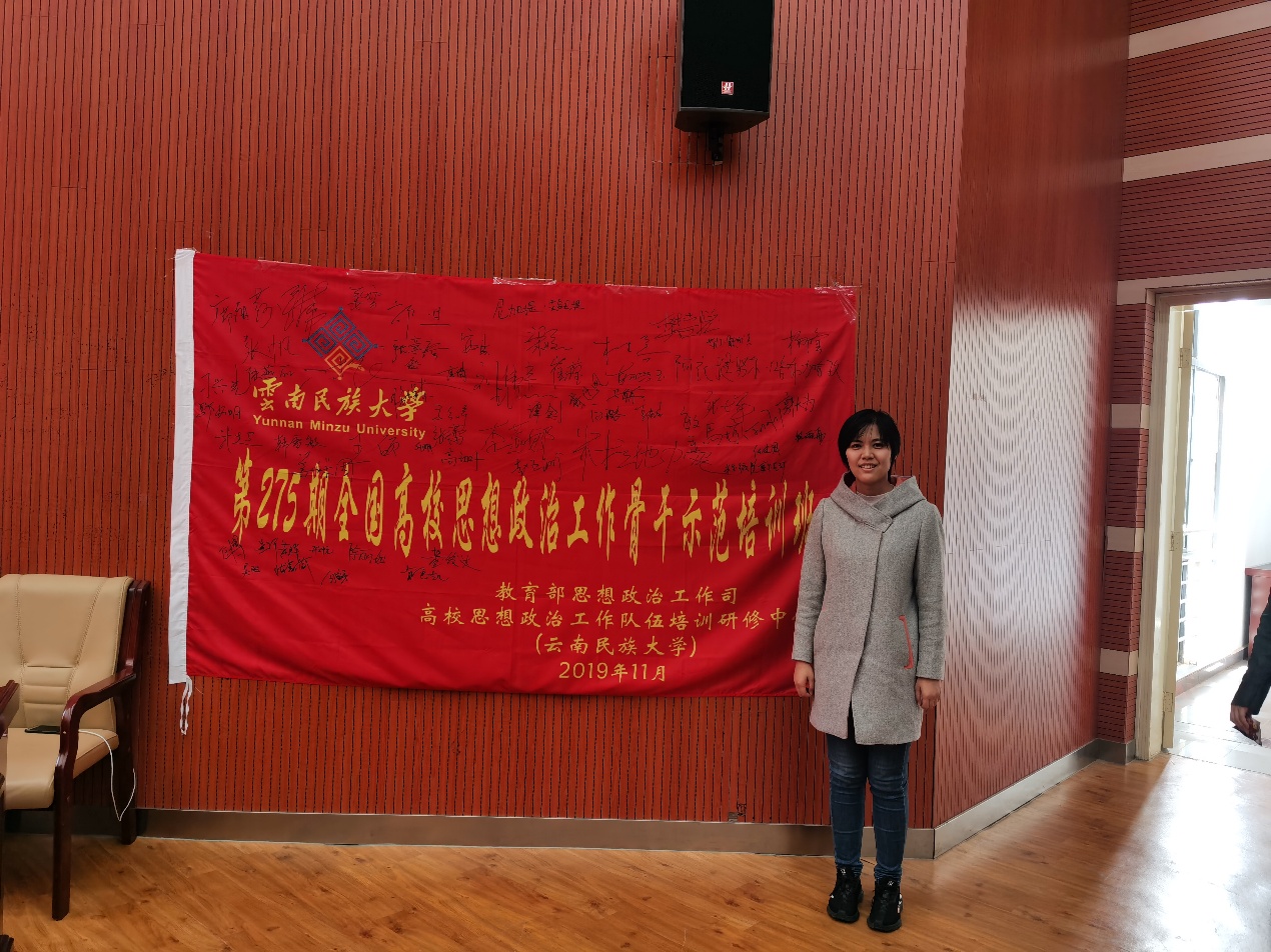 11月20-23日,教育部第275期全国高校思想政治工作骨干示范培训班在云南民族大学举行。来自全国95所高校的思想政治工作骨干教师齐聚云南昆明学习交流,MG冰球官网辅导员张蕾参加了此次培训。