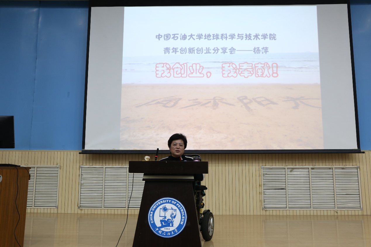 论坛伊始,主持人李文豪向到场教师及学生表示欢迎并介绍主讲人杨萍。随后,杨萍以“我创业,我奉献”为主题,向大家分享自己的创业故事。“相比庸碌一生,人生的价值更在于开拓、创新、奋斗、奉献。”杨萍同到场学生一起回顾了自己大起大落的人生,由于童年罹患小儿麻痹症而导致残疾的她被大学和工厂拒之门外。“从‘学霸’到‘无业游民’,那段时间我的自信在连续打击之下烟消云散。”将自己封闭了几个月后,一个偶然的机会,杨萍接触到了服装设计行业。她努力学习绘画设计和人体美学,凭借着坚强的信念和不服输的意志,拿到了服装大赛三个一等奖。然而在周围人非善意的讨论声中,杨萍一气之下离开了工作单位,想起过往的情景,杨萍语气中带着哽咽:“不信任的眼光一个接一个地落在我身上,我的自尊心自信心被极大地挫伤。”爱人遭遇车祸是生活给杨萍的迎头一击,面对高额治疗费用,不服输的杨萍将家庭扛在了肩上。为了赚钱,她找遍了青岛所有的服装企业,最终一家日本服装企业给予她机会,“最终我凭借技术、诚信、速度赢得了所有客户的信任,后来我被外贸公司戏称为‘杨一过’。”她笑着讲道。