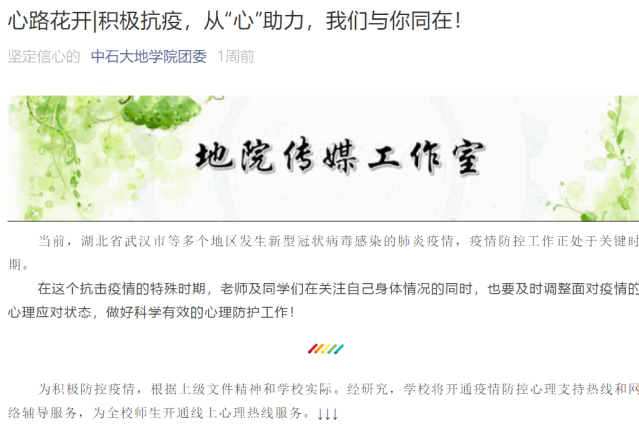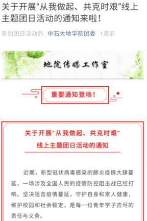 学院团委发布《MG冰球突破官网网站“从我做起、共克时艰”线上主题团日活动通知》《疫情防控,人人有责——地院学子承诺书》,开通同心战“疫”·我们在行动专栏,微信、QQ空间、易班三大平台同频发声,推送防疫知识,宣传战“疫”正能量,倡导全院学生自主学习、提升自我,坚定信心、做好防护,打赢疫情防控攻坚战。
