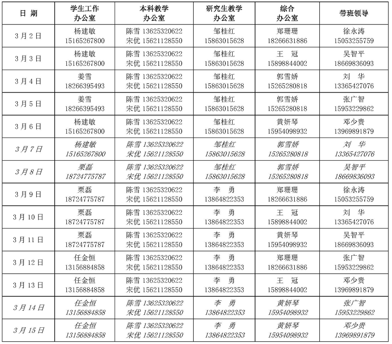 1、按照学校最新精神,延迟开学期间机关同志轮岗上班,分学工、本科教学、研究生教学、综合(含党务、行政、人事、科研)四个模块各自实行错峰到岗,以保障各路工作顺利进行。每日2位班子成员和4位机关人员同时上班,工作需要时其他人员随时到岗。