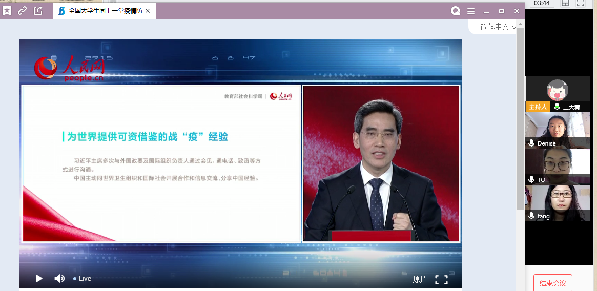 3月9日下午,由教育部社会科学司与人民网联合组织的“全国大学生同上一堂疫情防控思政大课”在人民日报社人民网“云开讲”。MG冰球突破官网网站积极响应,提前一天通过QQ群、微信群、微信公众号等多种渠道进行宣传,确保通知到位。在学院各党支部、团支部广泛组织学生观看直播,开展线上讨论,强化对思政课的理解和认识,提高学生党员担当责任意识,发挥党支部的战斗堡垒作用。