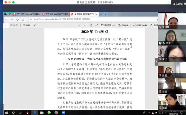 会议伊始,郑珊珊同志带领机关党支部全体同志解读学习了学校2020年工作要点,从坚持党建统领、加强统筹与规划、落实立德树人根本任务、推进人才强校战略、聚焦一流学科建设、坚持开放合作、改善办学条件七个方面,同时结合MG冰球官网的实际情况,具体解读了工作要点,为MG冰球官网接下来的工作开展提供了指导性意见。