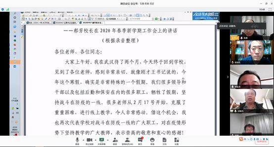 之后邱隆伟教授对学院新学期工作会议精神特别是2020年工作重点进行了说明,结合地质系的实际情况,对本学期工作进行了动员和安排。鄢继华副主任对本学期教学工作进行了梳理,对在疫情影响下如何开展线上教学、考试与考核、本科毕设、野外地质实习等工作进行了详细安排。并对面临的一些问题进行了说明,如线上教学学生反馈掌握情况、考试与考核多元化、毕设指导需要在教务系统记录等。王健副主任对实验室安全作了说明。
