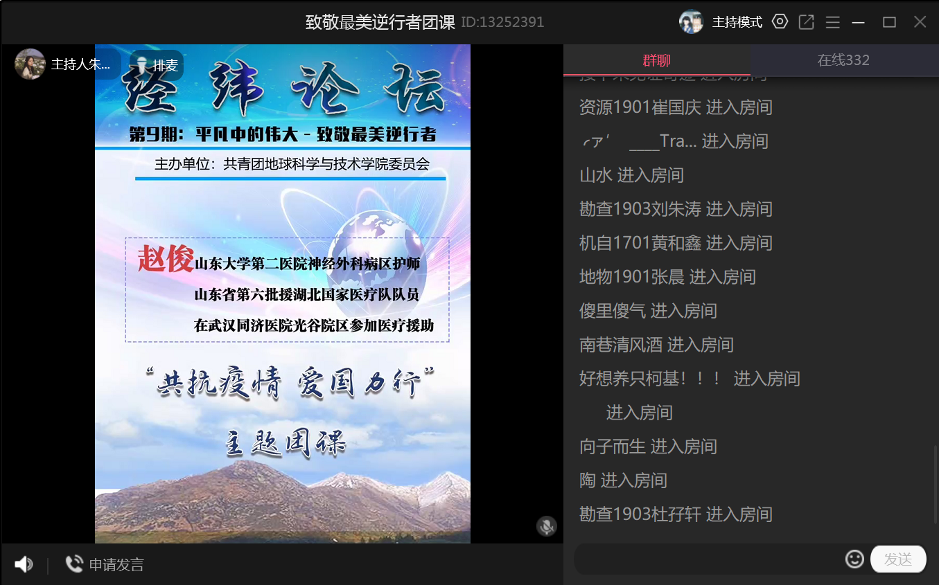 在全国上下同心战“疫”的特殊时刻,山东大学第二医院神经外科护师赵俊,挺身而出,勇于担当,成为一名“最美逆行者”,为广大团员青年树立了榜样。此次团课反响热烈,450余人在云端聆听,感受“共抗疫情、爱国力行”的朋辈力量。