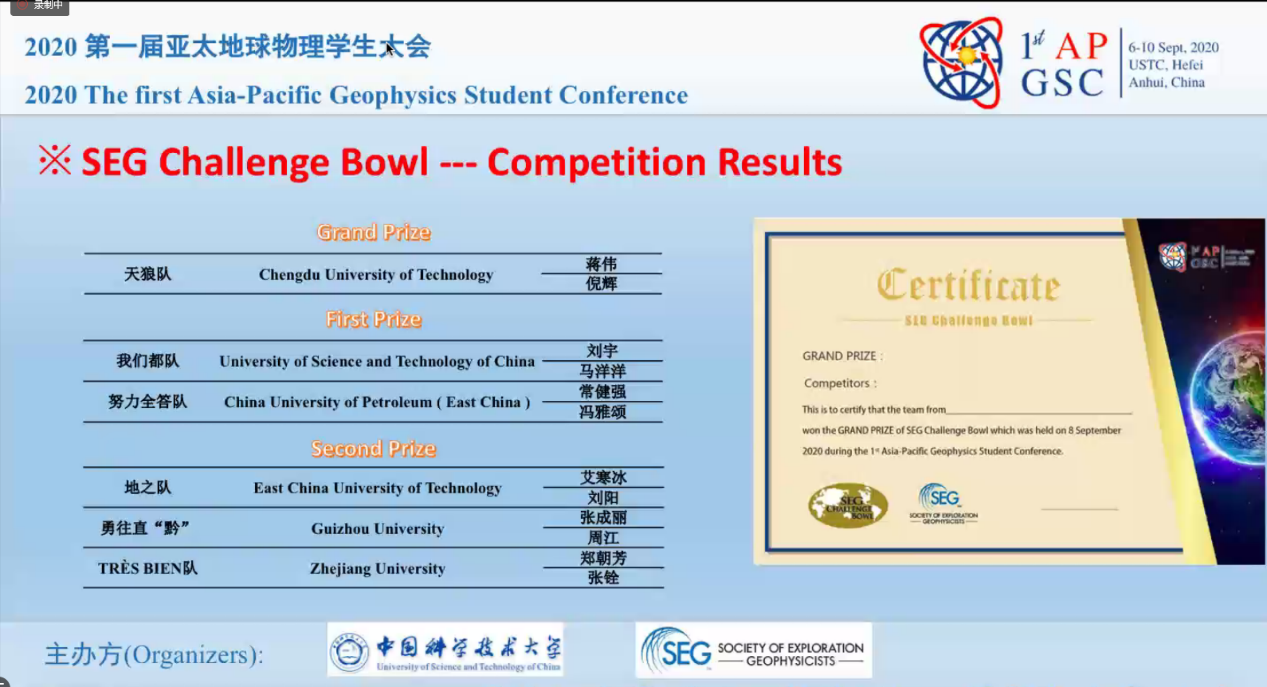 9月8日-9日,中国科学技术大学在线上举办第一届亚太地球物理学生大会暨SEG Challenge Bowl知识竞赛中国赛区决赛,来自MG冰球突破官网网站、中国科学技术大学、浙江大学、中国地质大学(武汉)等13所高校的代表队参加决赛。经过激烈角逐,MG冰球官网地质资源与地质工程2019级研究生常健强、冯雅颂组成的“努力全答队”获得第二名的好成绩,荣获一等奖,曹丹平老师获评优秀指导教师,MG冰球突破官网网站获优秀组织奖。
