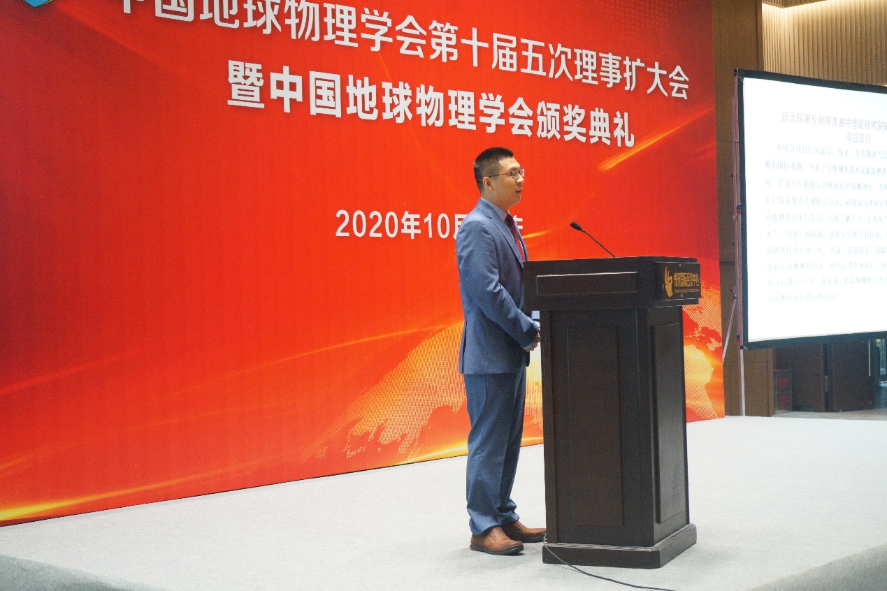 会上,中国地球物理学会理事长陈晓非院士,滕吉文院士、潘永信院士以及熊盛青、张东宁、底青云副理事长和郭建秘书长分别为中国地球物理科学技术进步一等奖获奖者和地球物理知识演讲大赛获奖者代表颁发证书。苏远大教授代表团队领奖,并发表获奖感言。