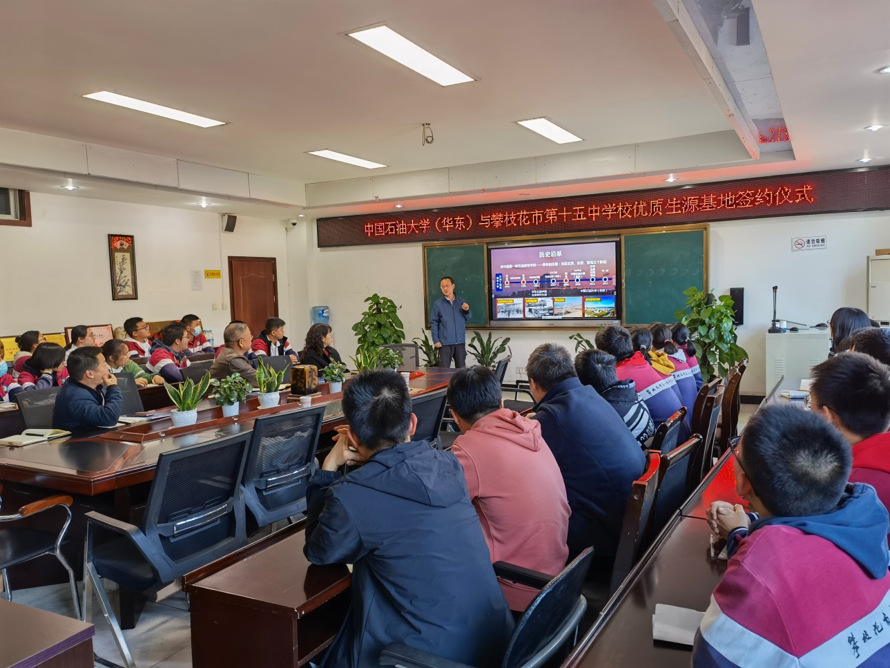 在攀枝花十五中学,龚安老师为成绩优秀的学生们作了《遇见石大,未来可期》的宣讲报告,让学生们多角度、全方位了解MG冰球突破官网网站,激励学生认真学习,引领优秀学生加盟学校。