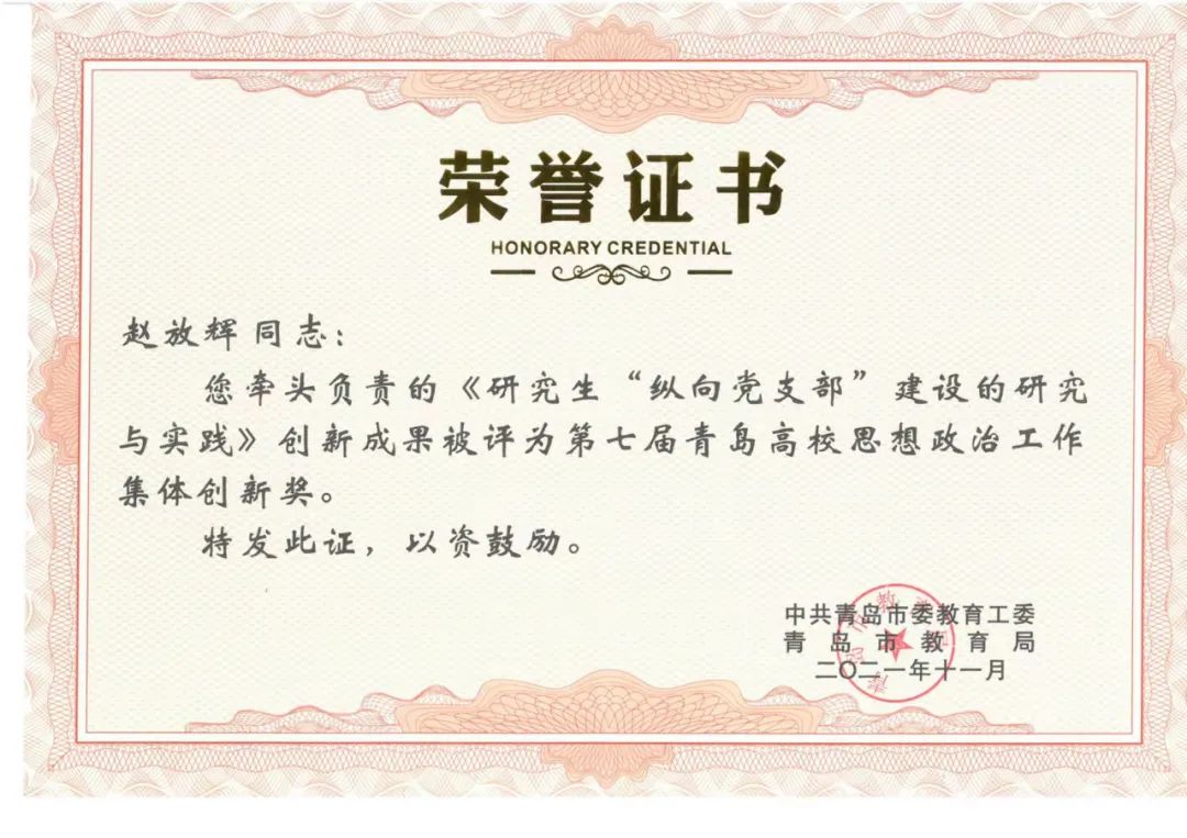 MG冰球官网赵放辉书记牵头负责的成果获青岛高校思想政治工作集体创新奖