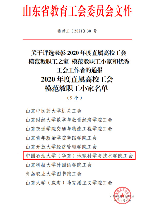 学院获评全民科学素质工作先进集体,学院党委获评山东省先进基层党组织,学院工会获评山东省教育工会模范教职工小家;地质系党支部顺利通过首批全国党建工作样板支部验收,储层地球物理实验室党支部入选第二批全国高校“百个研究生样板党支部”创建名单,资源系党支部获评山东省教育系统先进基层党组织;学院《研究生“纵向党支部”建设的研究与实践》项目获青岛高校思想政治工作集体创新奖;学院党委、地球物理系党支部被山东省推荐到全国竞争第三批新时代高校党建标杆院系和样板支部。