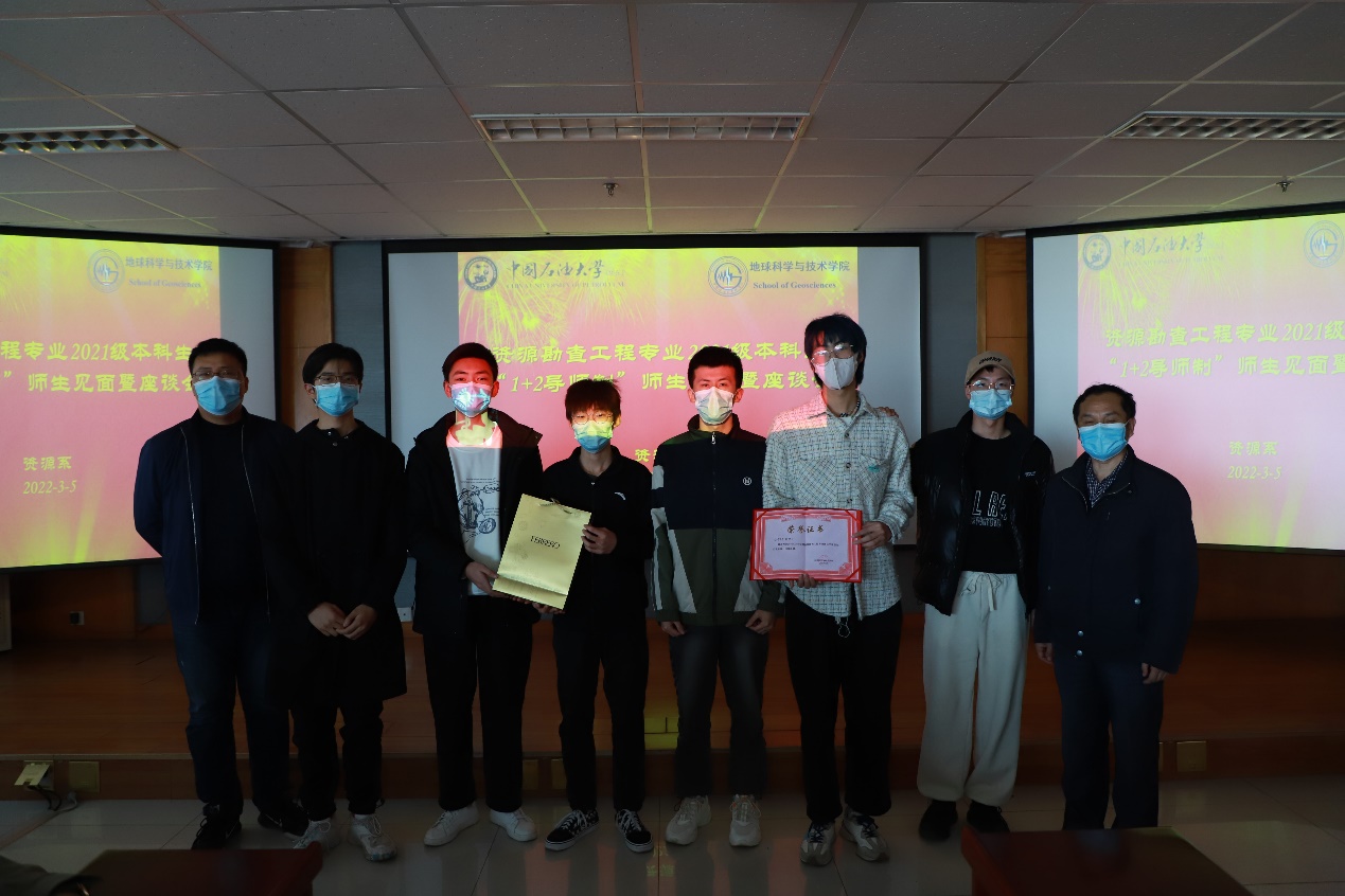 资源系党支部书记、主任张立强介绍了出席本次座谈会的各位老师并对全体师生的到来表示感谢。MG冰球突破官网网站副院长张宪国介绍了资源勘查工程专业的发展优势和导师制的重要性,并表示教师担负培养人才的重任,应在教书育人的工作中尽职尽责,从骨子里去爱护每一位学生。资源专业的学生应该认真学习专业知识,掌握最新的勘探技术,为油气勘探事业贡献青春力量。随后,由张宪国老师、徐守余老师,为资源2021级中表现突出的四个优良学风宿舍颁发荣誉证书。