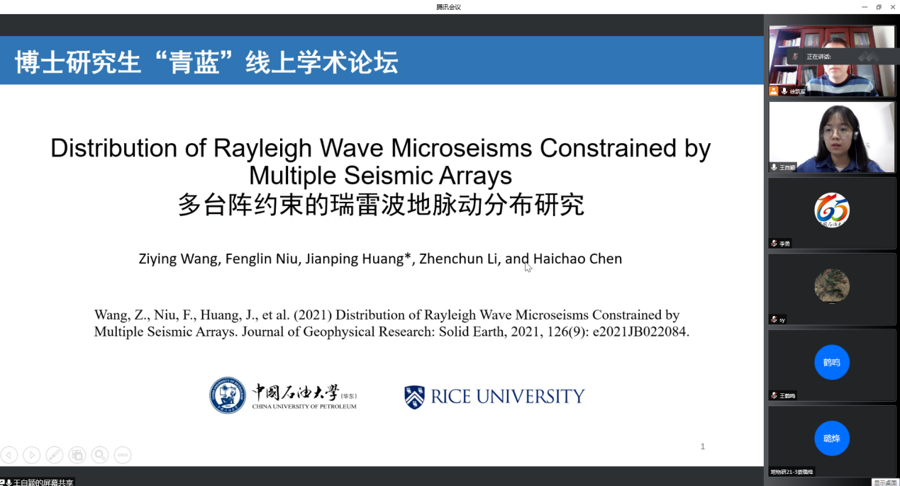 为进一步活跃研究生学术氛围,提高博士研究生的学术报告能力,在学校研究生院的大力支持下,博士研究生“青蓝”线上学术论坛MG冰球突破官网网站分论坛于4月8日下午正式开讲,报告均采用腾讯会议线上形式进行,会议由地球物理系副主任徐凯军副教授主持,来自学校的各级博士和硕士生共80余人参与交流。