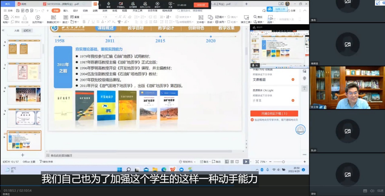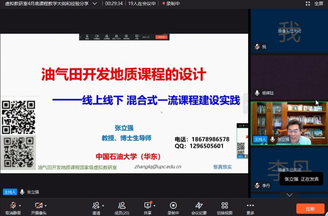 为响应教育部落实立德树人根本任务,加快教育高质量发展的号召,落实教育部加快推进虚拟教研室试点建设的工作要求,油田开发地质课程教育部首批虚拟教研室建设点从今年3月开始开展了系列研讨活动,规划了教研室2022年工作重点、规范了教学活动时间和相关制度。按照计划,4月29日,该教研室开展了教学大纲、教学经验分享研讨活动。来自MG冰球突破官网网站、山东科技大学、西北大学、西南石油大学、东北石油大学、西安石油大学、中国地质大学(武汉)、中国石油大学(北京)等12所高校的教研室骨干30余人参加了本次研讨活动。