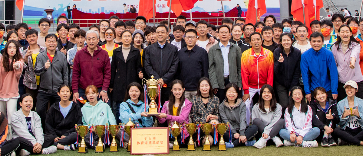 运动会斩获9座奖杯和道德风尚奖,校领导吴强明、周鹏与学院师生合影,学院领导、校工会主席王德钊等陪同。