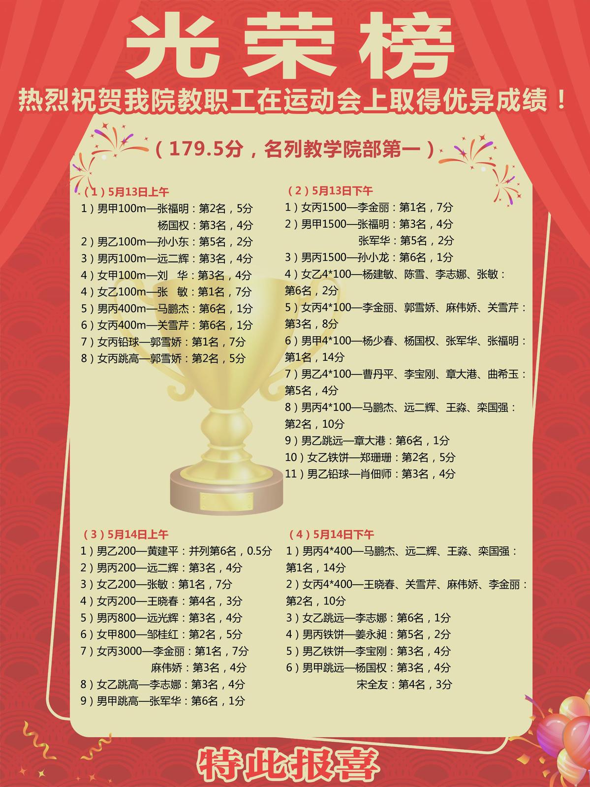 在2022年校教职工田径运动会上,MG冰球突破官网网站全体运动员顽强拼搏、奋勇争先,取得全校第二、教学院部第一的优异成绩!今年运动会在两个得分较多的保研辅导员读研,男丙杨升宇、程斌受伤不能参赛,理学院一个系并入化院等诸多不利形势下,院工会及时筹划、精心组织,老教师以身作则,广大教职工积极奋战,科研助理、师资博士后全力出击,依然傲视各大院,取得辉煌战绩,成绩可喜可贺!
