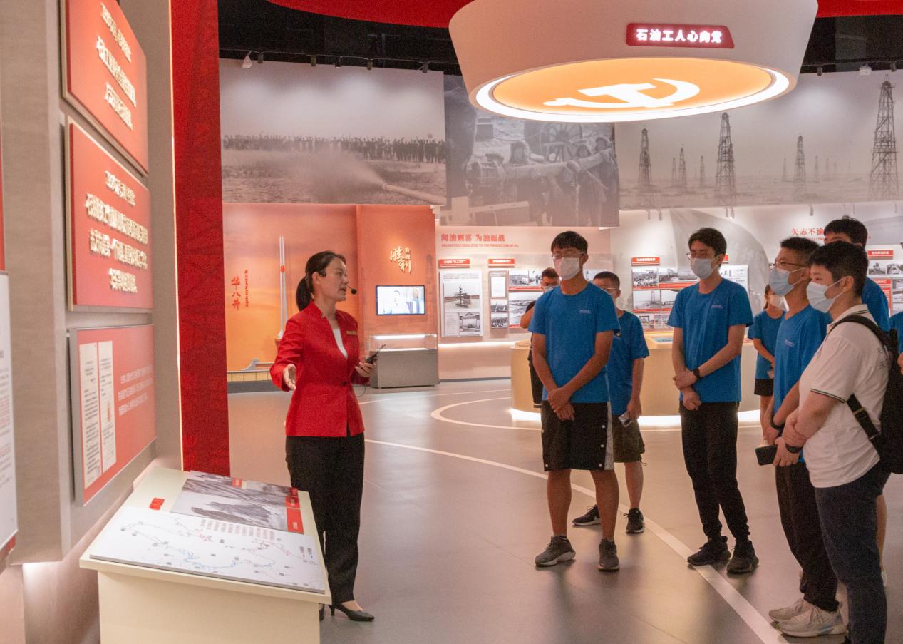 胜利油田优良传统展厅内,实践队员在“石油工人心向党”的口号照耀下学习石油精神、感悟石油文化 李洪刚摄影
