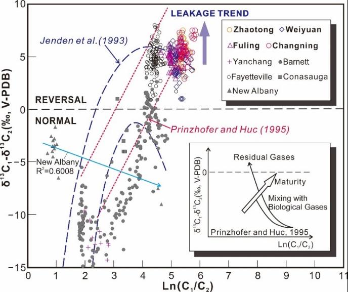 四川盆地龙马溪页岩气δ13C1-δ13C2与ln(C1/C2)关系分布图