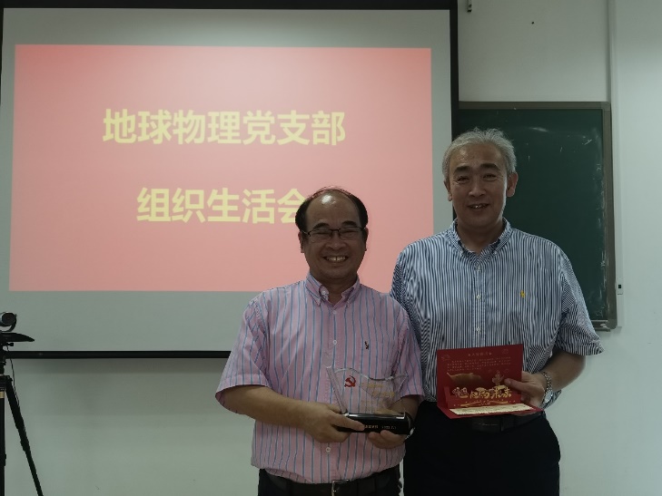 张凯介绍了近几年党组织给光荣在党50年、30年等的老党员颁发纪念品的情况,我系党支部目前有印兴耀、李振春、符力耘、杨国权、张军华、吴国忱、乐友喜、孙成禹和张繁昌等9位党员同志的党龄达到或超过30年,因此开展庆祝党员“政治生日”主题党日活动,并邀请学院党委赵放辉书记为这些党员同志(在现场7人)颁发精心准备的“政治生日”贺卡和纪念摆台,其余党员纷纷送上衷心的祝福。