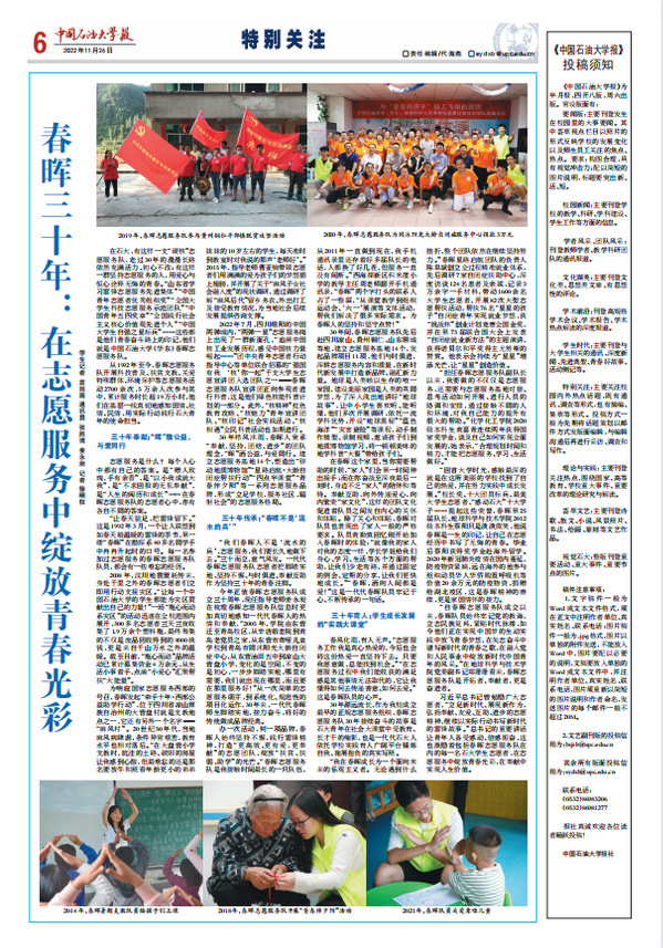 近日,中国石油大学报整版报道MG冰球官网春晖志愿服务队30年志愿服务事迹,获得师生广泛关注,引发热烈反响,现将相关内容摘录如下。