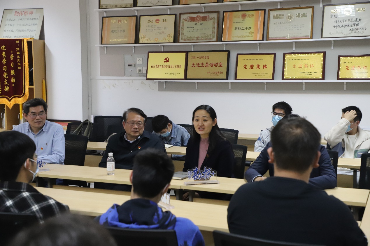 蒋有录教授向大家介绍道:“孙健初先生是第一位跨越祁连山的中国地质学家,探明并开发了玉门油矿,建成中国第一个石油工业基地,是中国石油地质的奠基人,培养了中国第一批石油地质人才。我国最早、最系统的沉积岩石学专著主要撰写人冯增昭,杰出教育学家、社会活动家、著名地质学家张一伟……,我校勘探系一大批杰出科学家为祖国石油地质行业做出了突出贡献,同学们要以他们为榜样,认真学习石油地质知识,传承好学院油气地质事业的火炬。”
