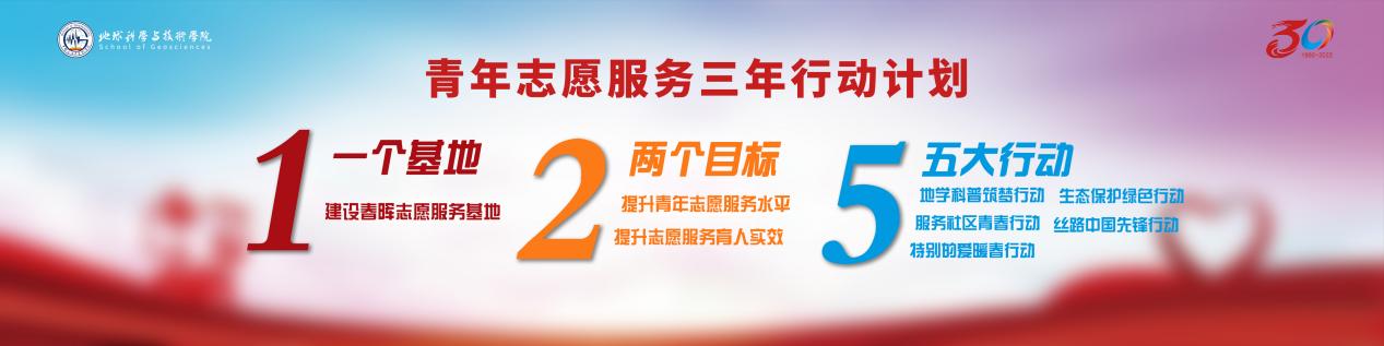会上,发布了《春晖志愿服务队青年志愿服务三年行动计划》。接下来的三年,春晖志愿服务队将重点建设服务基地,致力于提升青年志愿服务水平和提升志愿服务育人实效。通过建设移动地质博物馆,服务全民科学素养提升,开展地学科普筑梦行动;通过开展常态化社区服务,服务国家治理体系现代化,开展服务社区青春行动;通过面向特殊群体开展暖心关爱活动,服务构建和谐文明社会,开展特别的爱暖春行动;通过结合学科特色,传播生态环保理念,服务生态文明建设,开展生态保护绿色行动;通过开展政策宣讲、文化传播、语言教学,服务“一带一路”倡议,开展丝路中国先锋行动。