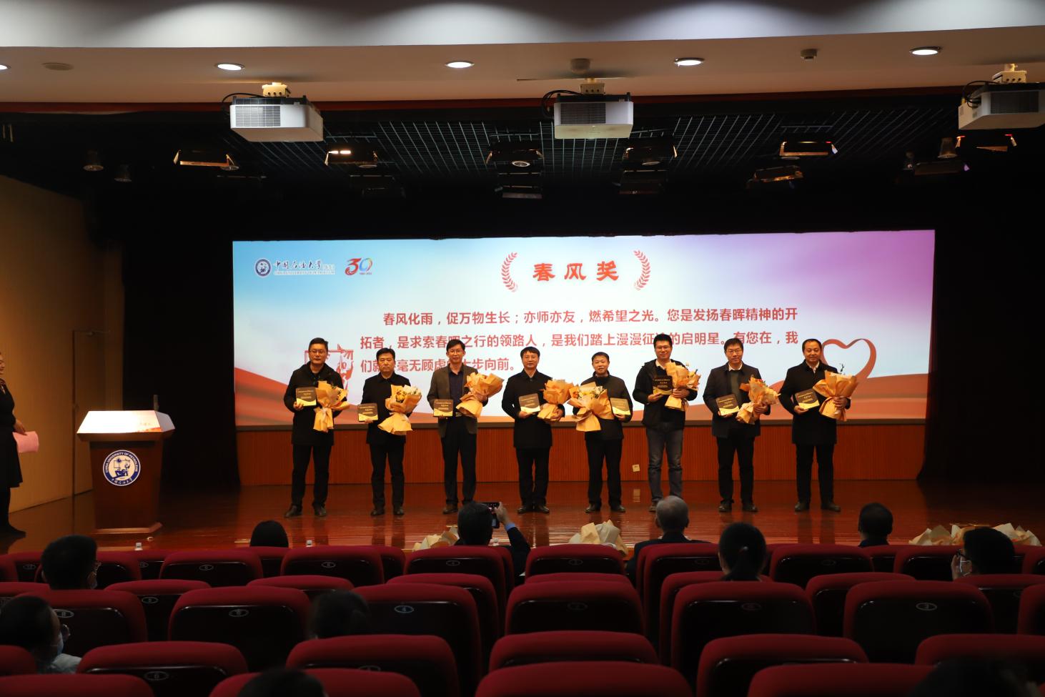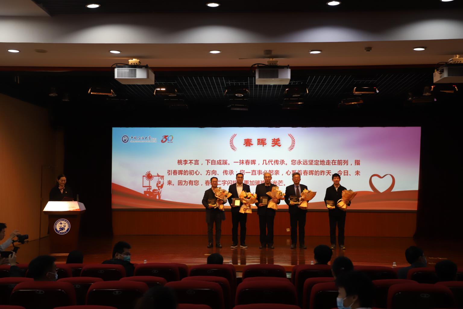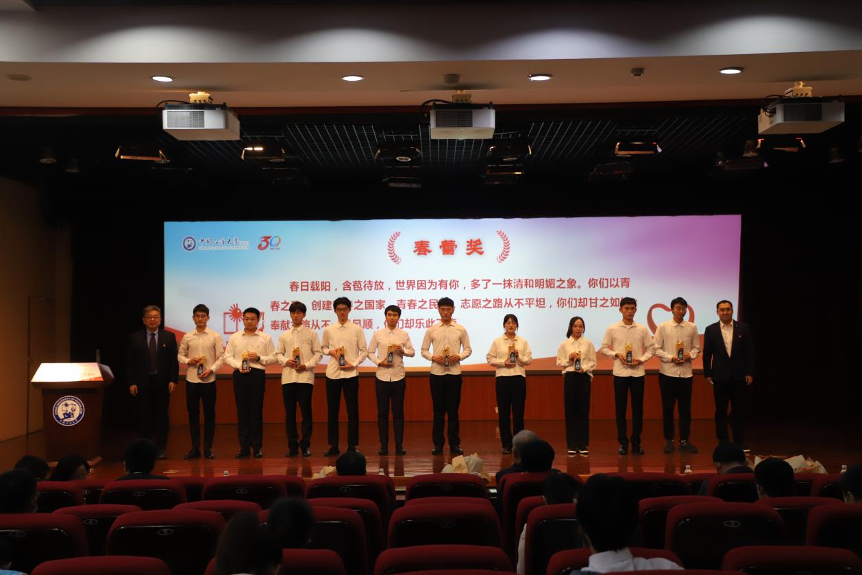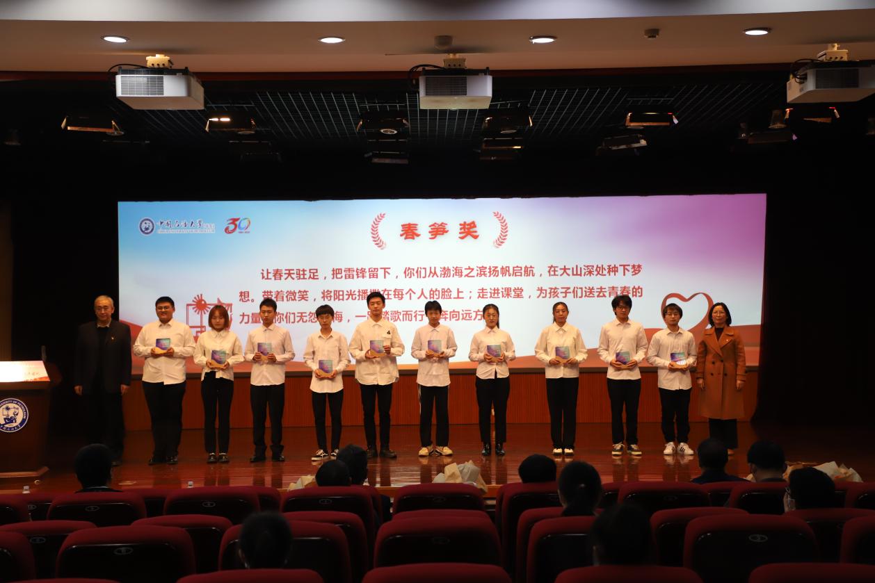 值此成立三十周年之际,春晖志愿服务队设立“春晖奖”“春风奖”“春笋奖”“春蕾奖”,致敬和表彰全体春晖人无私无畏、担当奉献的过往。春晖志愿服务队队员代表为在春晖建设和发展过程中给予关心指导的领导老师代表敬献鲜花和纪念奖牌,赵放辉、梁秀萍为大龄自闭症帮扶团队、麻风村支教团队、移动地质博物馆团队等10个优秀团队颁发奖牌,陈勇、季林海为徐旺、王瑞丰、王建侨等10名优秀同学颁发奖牌。