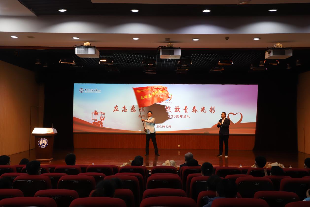 高扬旗帜,再起征程,校团委书记季林海为春晖志愿服务队授旗,激励队员们在融入党和人民事业中绽放新时代石大青年的风采。