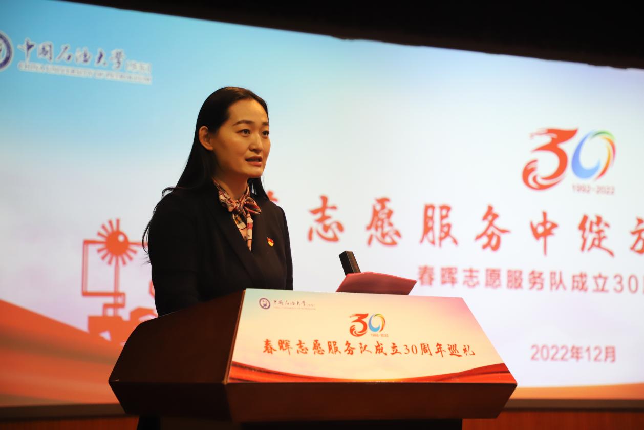 学校党委常委、学院党委书记赵放辉,国家大学生科技园办公室主任、青岛中石大科技教育集团有限公司党委书记、董事长陈勇,校团委书记季林海、党委组织部副部长梁秀萍、党委学生工作部(武装部)副部长张万春、继续教育学院副院长胡义贵以及历届指导老师成宏涛、刘海庆、魏垂高、于华帅、刘明、徐永涛、孙启龙、徐拥军和各教学院部团委书记、春晖志愿服务队学生代表参加庆祝活动,学院党委副书记郑珊珊主持活动。与会人员一起回顾春晖成立、发展的三十年奋进历程,共同铺展春晖未来建设的前进方向。