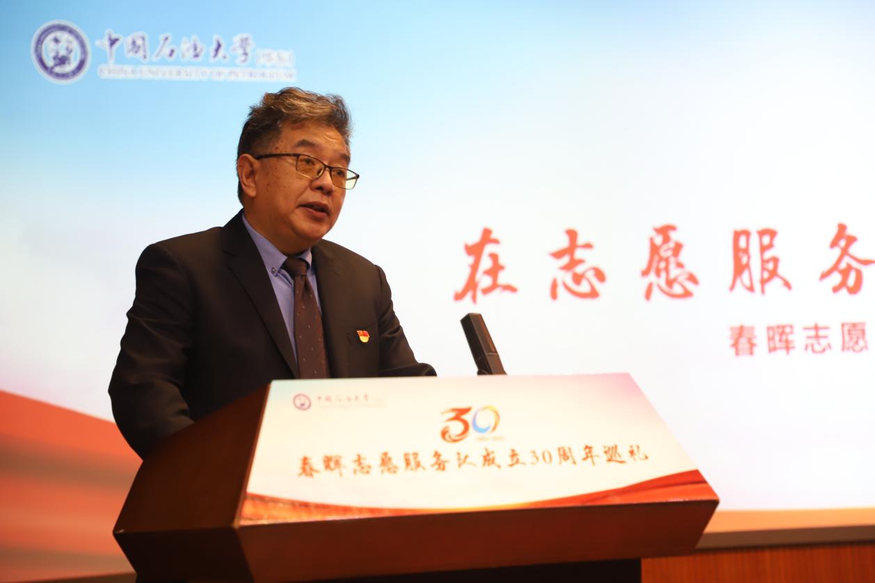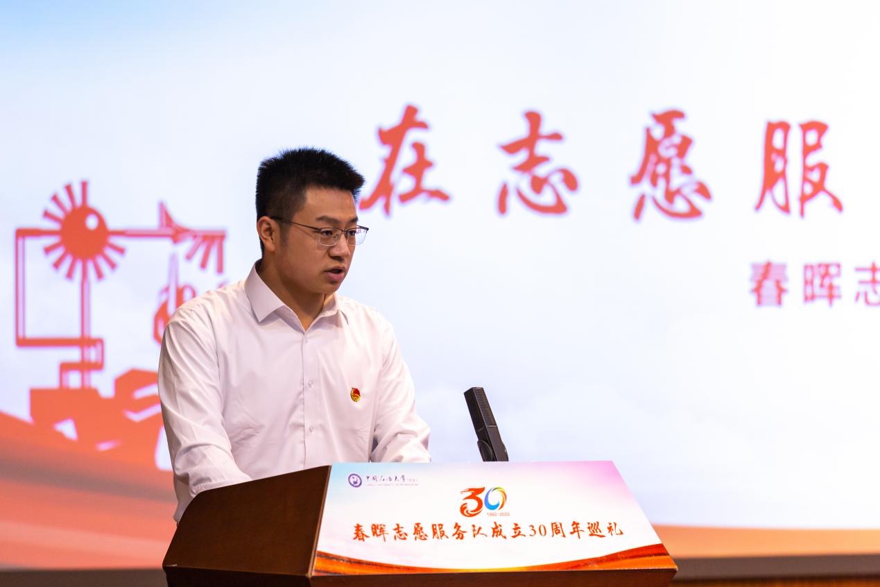 三十载岁月悠悠,春晖志愿服务队的老师和同学们在实践中熔铸感情、在服务中倾注心血。国家大学生科技园办公室主任,青岛中石大科技教育集团有限公司党委书记、董事长,MG冰球突破官网网站原团总支书记陈勇代表指导老师分享了感受,深情回顾了30年前春晖成立之初的背景和故事。他表示,春晖志愿服务队不仅仅是个志愿服务队,更是一份传承,一份情怀,为自己曾在这样一支团队而感到自豪。他向全体志愿者们发出号召,在热情服务中感知幸福、了解社会、实现价值,在真情奉献中彰显朝气、汇集爱心、担当责任。