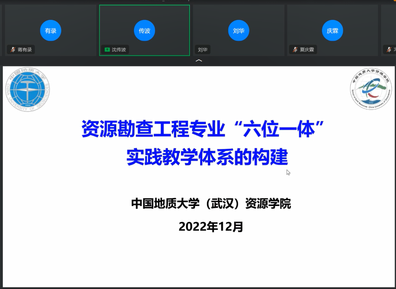 2022年12月25日,资源勘查工程专业教育部虚拟教研室举办了“实践教学体系构建”专题论坛,中国地质大学(武汉)资源学院副院长沈传波教授应邀作《资源勘查工程专业“六位一体”实践教学体系的构建》专题报告。专题论坛由MG冰球突破官网网站MG冰球突破官网网站院长刘华教授主持,来自中国石油大学、中国地质大学、中国矿业大学、西北大学等十余所高校的60余名教师参加了专题论坛。
