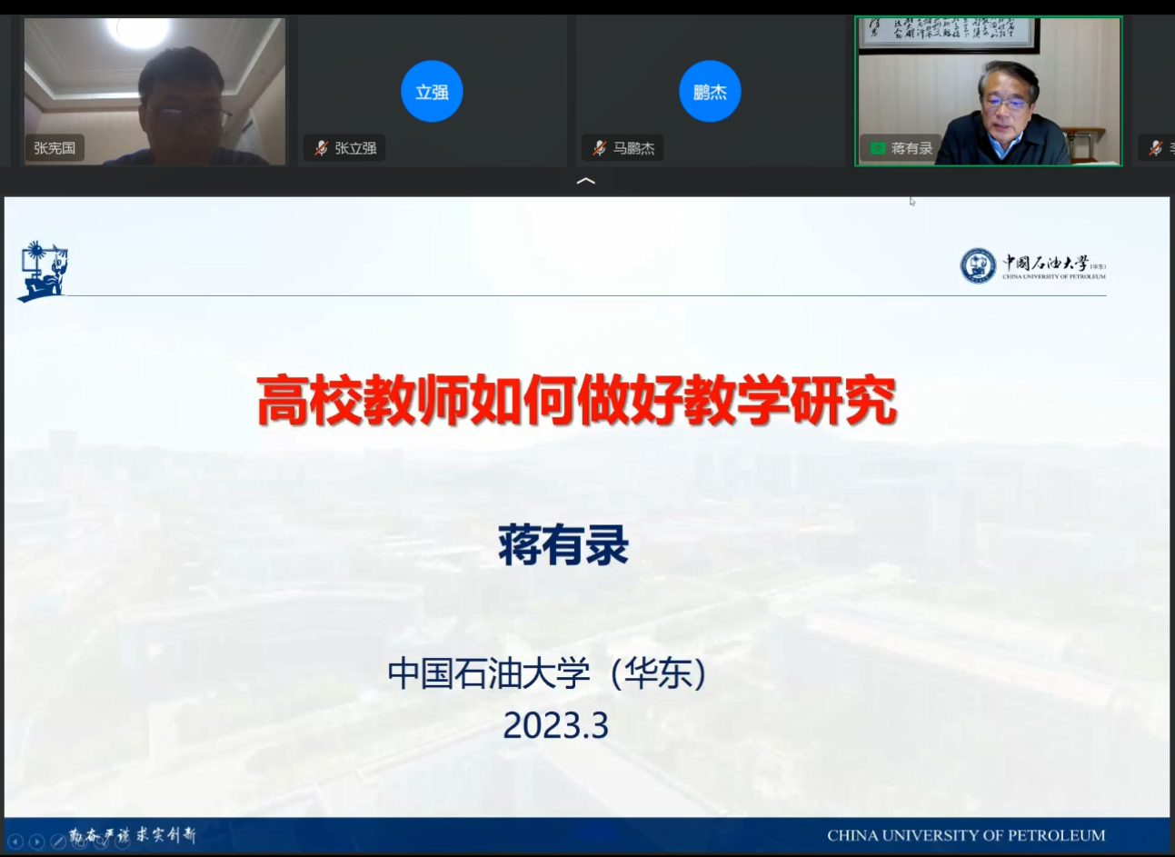 2023年3月30日,资源勘查工程专业教育部虚拟教研室举办了“教学研究专题论坛”,教研室主任、国家级教学名师蒋有录教授作了“高校教师如何做好教学研究”的专题报告。专题论坛由MG冰球突破官网网站MG冰球突破官网网站副院长张宪国教授主持,来自中国石油大学、中国地质大学、中国矿业大学、西北大学、长安大学、山东理工大学等十余所高校的60余名教师参加了专题论坛。