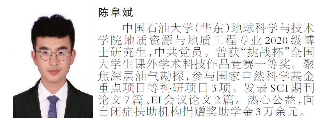 陈阜斌,男,中共党员,地质资源与地质工程专业2020级博士生,师从宗兆云教授。他聚焦深地油气勘探领域,以第一作者在《JGR: Solid Earth》、《Geophysics》等权威地球物理期刊发表学术论文7篇,EI会议论文2篇;作为科研骨干参与国家自然科学基金委面上、重点等国家级项目3项,主持2项校级科研项目;参加7次国内外学术会议,口头报告4次。先后荣获第十二届“挑战杯”中国大学生创业计划竞赛金奖、第十七届“挑战杯”全国大学生课外学术科技作品竞赛一等奖、中国地球科学联合学术年会“学生优秀论文奖”、人民网奖学金二等奖、中国电信奖学金-天翼奖。热心公益,累计向困难自闭症家庭捐献奖学金3万余元。