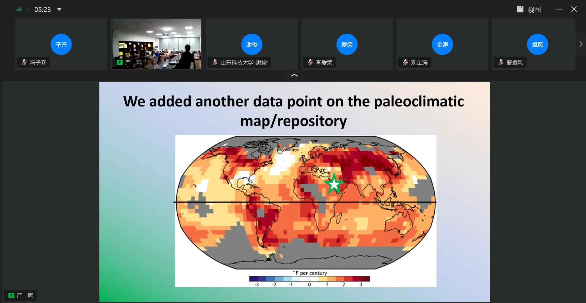 2023年7月5日晚,教育部“油气田开发地质课程虚拟教研室”举办线上教学公开课—学科前沿专题讲座,邀请了美国密苏里科技大学博士生导师杨晚教授作题为《Proxy-Based Palaeoclimatology and Holocene Climate Changes from a Saudi Arabia Record》的专题报告,地质资源与地质工程专业研究生、资源系部分教师,以及来自山东科技大学、西北大学、中国地质大学(武汉)、贵州大学和东北石油大学等全国十余所高校科研院所70余人参加了线上、线下会议,教育部虚拟教研室负责人、资源系主任张立强教授主持会议。