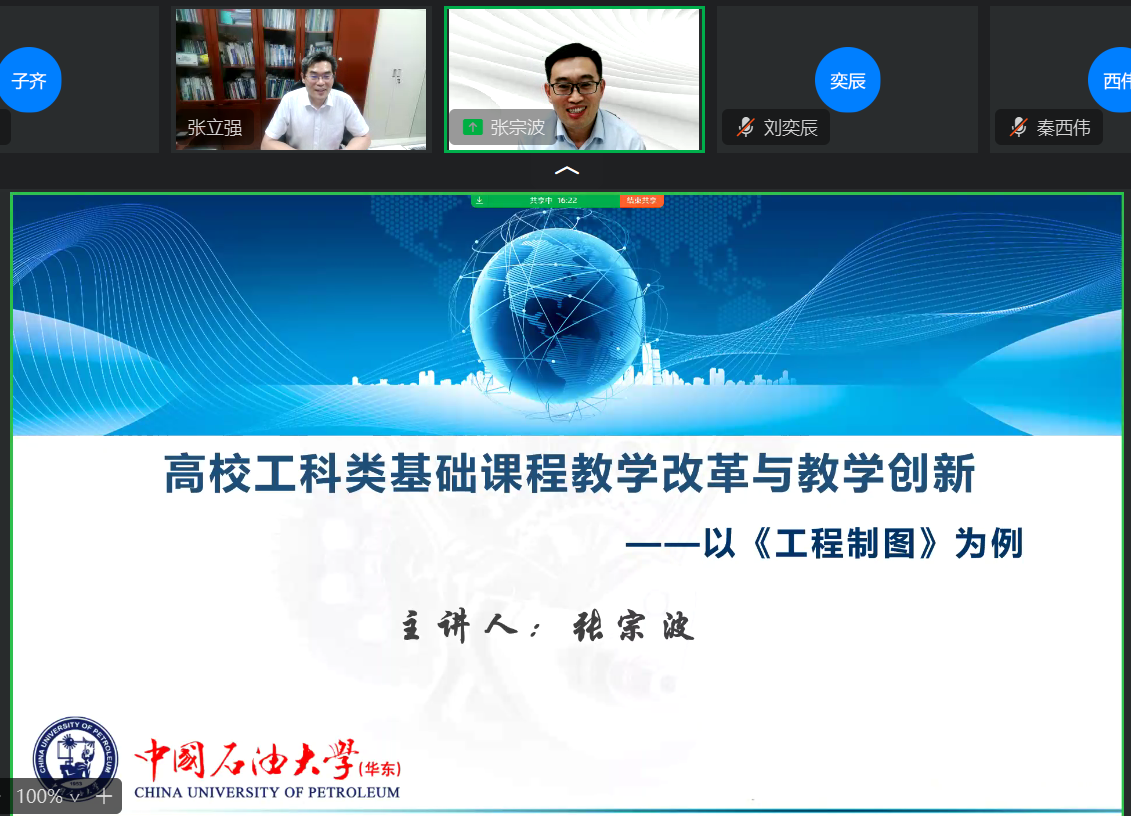 2023年9月8日晚,教育部“油气田开发地质课程虚拟教研室“举办课程教学创新及讲课比赛专题讲座,邀请了MG冰球突破官网网站教授张宗波作题为《高校工科类基础课程教学改革与教学创新大赛—《工程制图》为例》的专题报告,资源系部分教师,以及来自山东科技大学、西北大学、中国地质大学(武汉)、贵州大学和河北工程大学等全国十余所高校科研院所70余人参加了线上会议,教育部虚拟教研室负责人、资源系主任张立强教授主持会议。