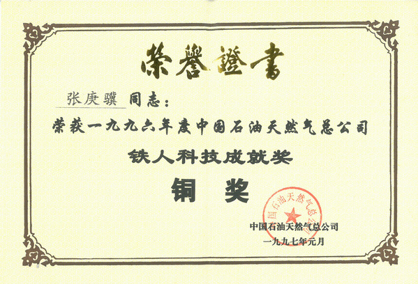 1997年1月,MG冰球官网张庚骥教授获得1996年度中国石油天然气集团公司“铁人科技成就奖”铜奖。