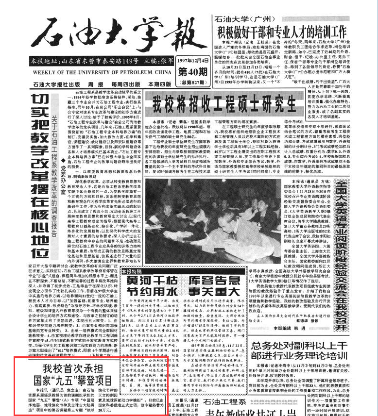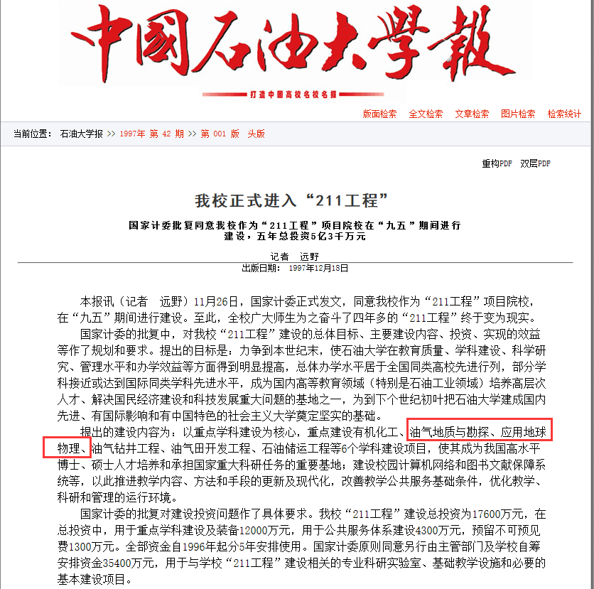 1997年11月26日,国家计委正式发文,同意石油大学作为“211工程”项目院校在“九五”期间进行建设。MG冰球官网油气地质与勘探、应用地球物理学科入选重点建设学科。