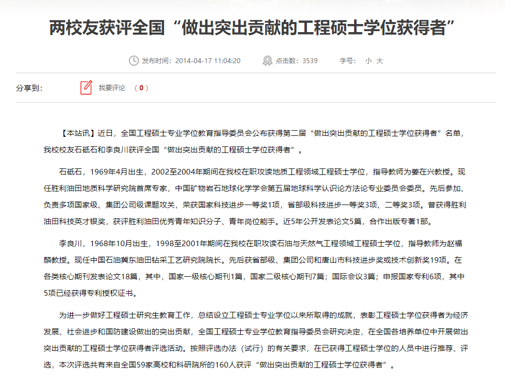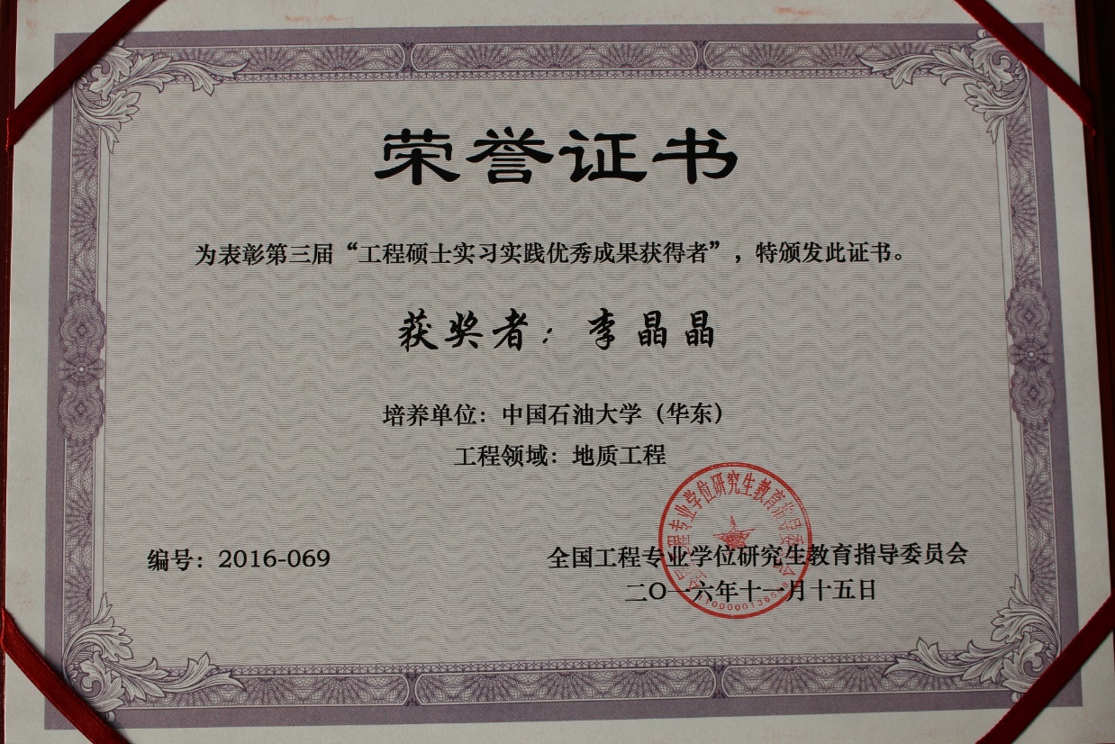 2016年11月,全国工程专业学位研究生教育指导委员会发布《关于公布第三届“工程硕士实习实践优秀成果获得者”荣誉称号名单的通知》,MG冰球官网2015届全日制工程硕士毕业生李晶晶获得该荣誉称号。