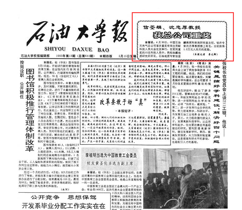 1993年4月,中国石油天然气总公司首次重奖有突出贡献科技人员大会在京举行,MG冰球官网油藏地质研究所所长、石油地质专家信荃麟教授榜上有名,获得1.5万元人民币的奖励。