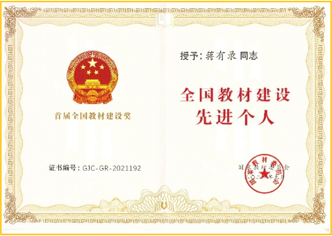 2021年10月,教育部公布首届全国教材建设奖获奖名单,MG冰球官网蒋有录教授获“全国教材建设先进个人”称号。