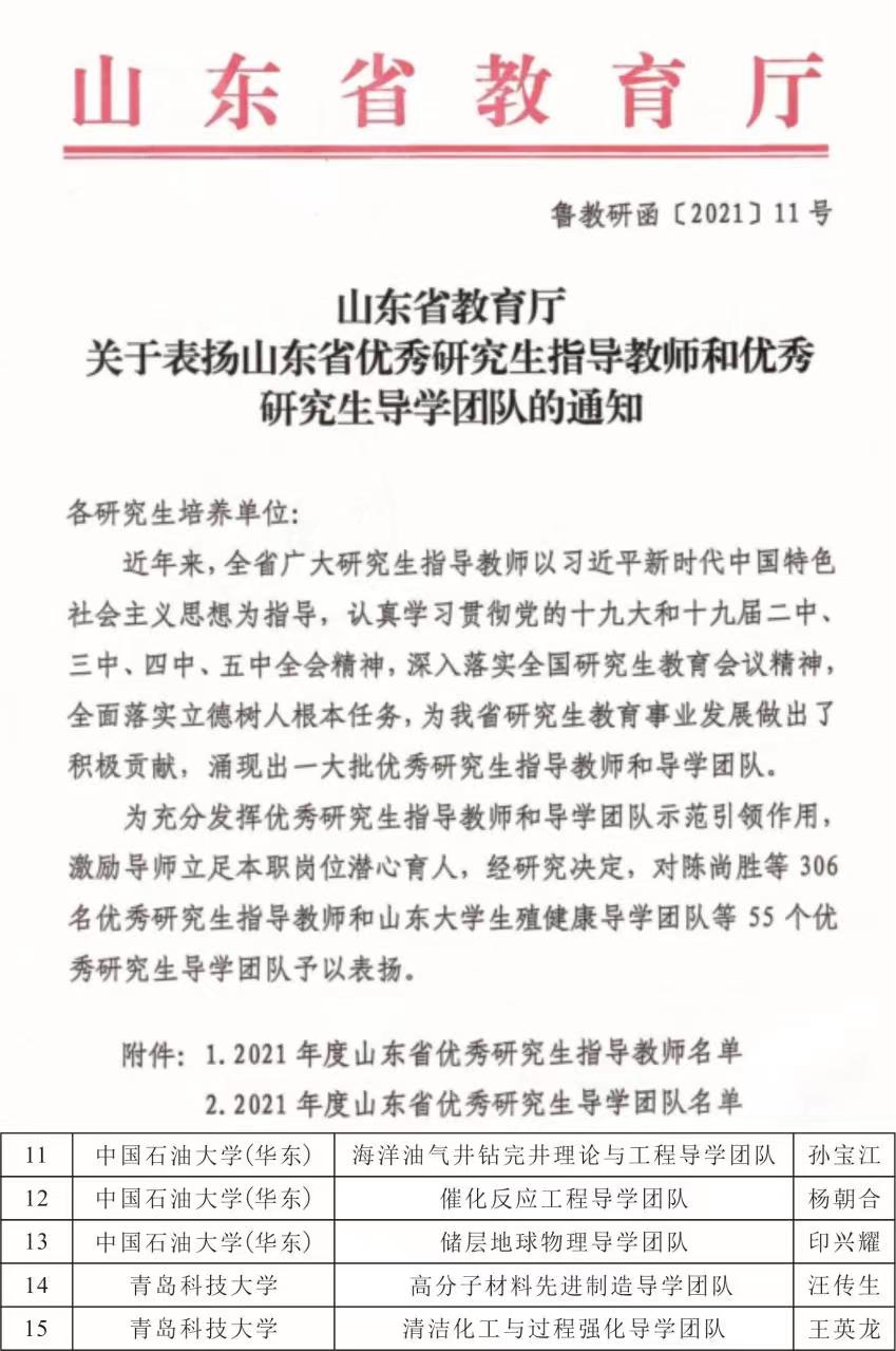 2021年9月,山东省教育厅发文公布山东省优秀研究生导学团队名单,MG冰球官网印兴耀教授负责的储层地球物理导学团队名列其中。