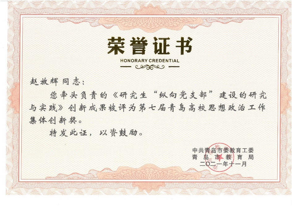 2021年11月,青岛市委教育工委公布第七届青岛高校思想政治工作创新奖获奖名单,MG冰球官网申报的项目《研究生“纵向党支部”建设的研究与实践》获青岛高校思想政治工作集体创新奖,是我校唯一获集体创新奖的项目。