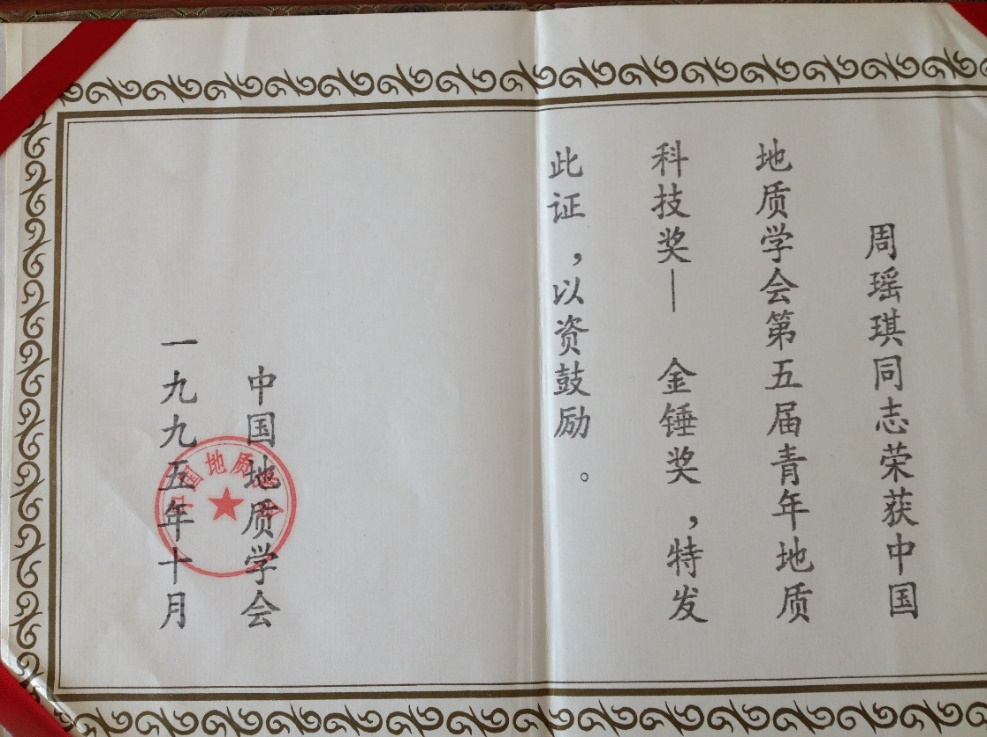 1995年11月,MG冰球官网年轻博士后周瑶琪教授荣获中国地质学会青年地质科技奖——“金锤奖”。