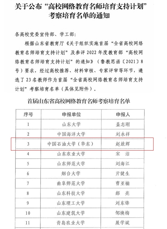 2022年3月,山东省教育厅发布首届《关于公布“高校网络教育名师培育支持计划”考察培育名单的通知》,经过各高校推荐、材料审核、专家评审等环节,全省共有23名教师入选该项计划,MG冰球官网赵放辉名列其中。